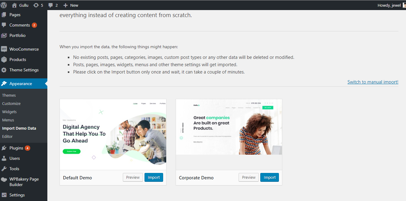 If you failed to import the demo content by one click then you have to follow the below steps to import the demo content manually.  You will get all demo content data with the theme package. You will find the demos in ‘gullu>inc/demo{disired-demo-number} this path.